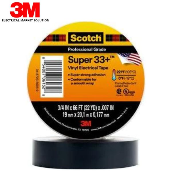 Scotch® Super 33+ Vinyl Electrical Tape is a 7 mil thick, premium grade tape that provides electrical insulation for all wires and cables rated up to 600V. The flame retardant tape withstands a temperature range of 0 to 221 °F ( 18 to 105 °C). It is compatible with solid dielectric cable insulation, synthetic cable insulations, jackets and splicing compounds.